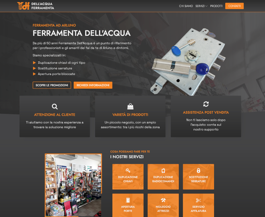 Nel caso specifico della Ferramenta dell'Acqua, ci siamo concentrati sulla creazione di un'immagine forte e riconoscibile, che riflettesse la solidità e l'affidabilità del negozio fisico. Per questo motivo, abbiamo optato per una palette colori che richiamasse il logo aziendale, utilizzando tonalità di grigio scuro e arancione. Il grigio scuro trasmette professionalità, mentre l'arancione aggiunge un tocco di energia e modernità. Per quanto riguarda i font, abbiamo scelto uno stile chiaro che facilitasse la leggibilità.