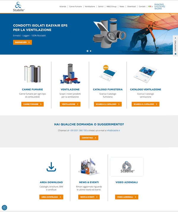 All'interno del sito web è presente un'area dedicata ai prodotti offerti dall'azienda, suddivisi tra canne fumarie e ventilazione.