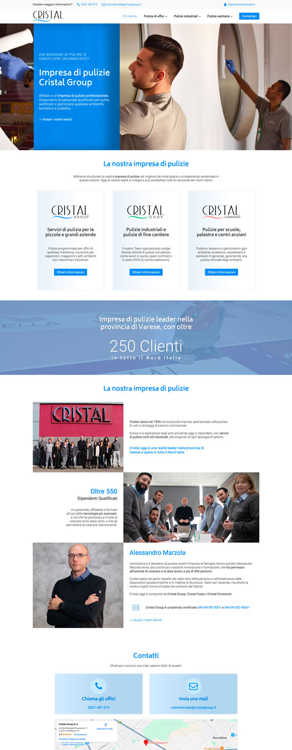 Cristal Group è un’impresa di pulizie specializzata in differenti ambienti lavorativi, come gli spazi di lavoro, le industrie oppure le scuole e le strutture sanitarie. Per differenziare ogni tipologia di servizio offerto abbiamo deciso di realizzare tre differenti landing page, ognuna dedicata a presentare con chiarezza uno specifico servizio.